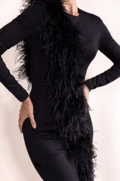 Treat yourself to some newness with our sophisticated Claire midi dress. Featuring a high neckline and long sleeves, what makes this design special is the gorgeous feather trim detail that starts on the shoulder and beautifully drops to the hem. Designed with our premium jersey fabric in a classic black shade to contour your hourglass silhouette and make an entrance at your birthday party, glam night out or black-tie event. Simply gorgeous!