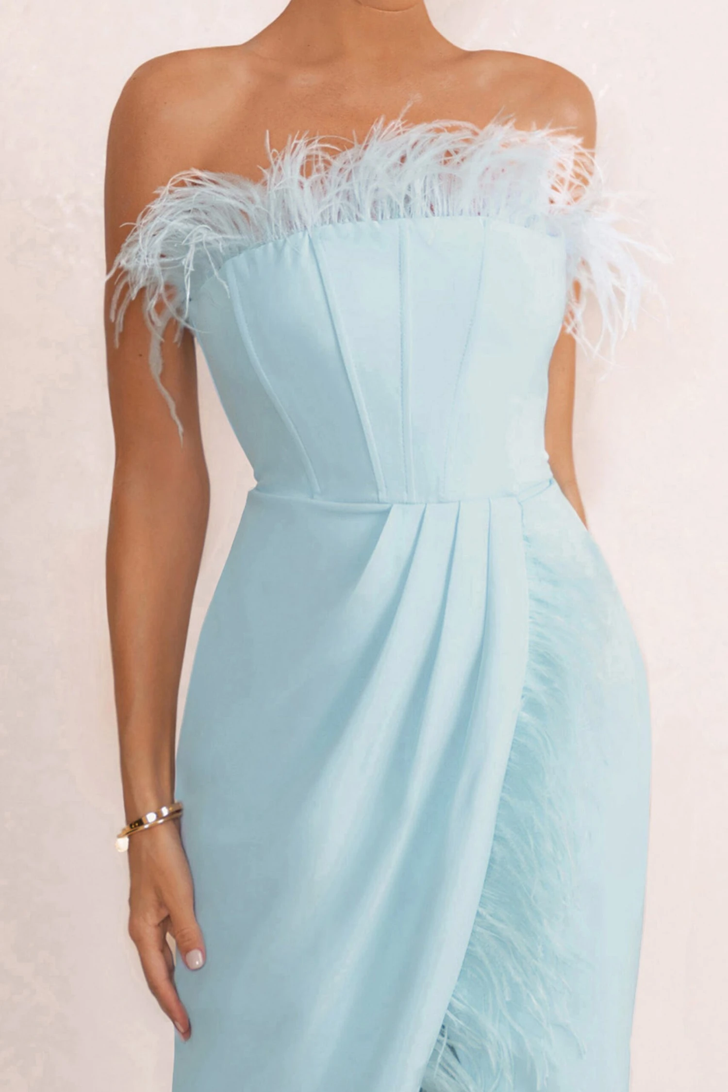 Pour yourself a cosmo cocktail and get ready to party in this aptly-named maxi dress. As sweet and enticing as the drink itself, our Cosmo gown is made from powder blue crepe in a corseted wrap silhouette with fine feather trims. Pair this strapless maxi dress with silver hoops for an unforgettable birthday or bottomless brunch look.