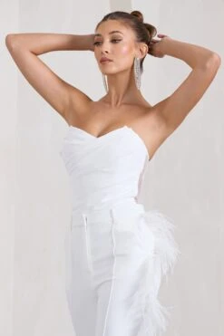 Our “Coupled Up” bodysuit delivers on glamour with its structured corsetry design and sheer panelled back. We adore the strapless cross over neckline with its pleated detailing, which delivers a super feminine look. This stunning bodysuit is worked in a luxurious crepe satin and is finished with a zip fastening… beautiful!