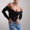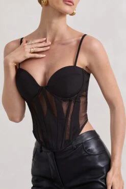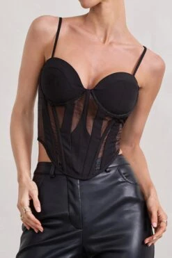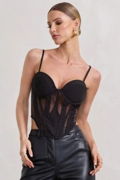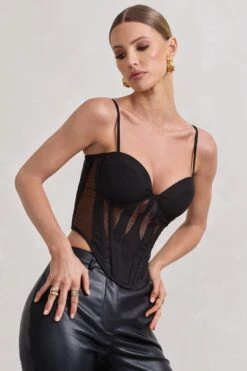 Sculpt your silhouette in our latest corset Electra. This structured top arrives in a classic black shade, featuring a boned bodice and wired padded cups for that bit of extra support. Detailed by eye-catching mesh panels, try pairing this piece with our Billie trousers for the perfect night out ensemble.