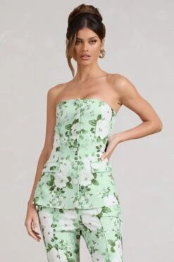 From office days to evening drinks, Elliana is the sophisticated top to take you stylishly from day into night. This strapless top features classic suit accents like flap pockets, waist darts and a hemline notch. Closed up the front with a line of covered buttons, this tailored bandeau would pair perfectly with the matching Kehlani trousers in florally-printed cotton.
