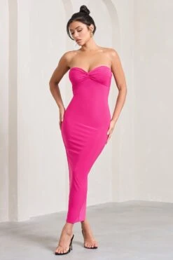 Crafted in our signature stretch jersey, this strapless dress was designed to outline your natural feminine curves. Arriving in a hot pink shade, Evita is features a sweetheart neckline flourished with a twisted knot detail. Try pairing this maxi dress with strappy stilettos for the ultimate graduation or dinner party outfit. Â