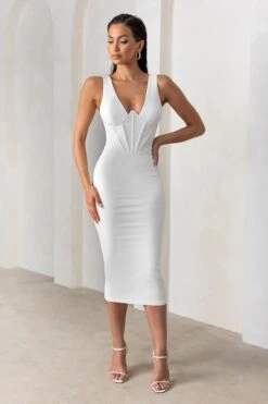 Feeling Good | White Plunge Neck Corset Midi Dress