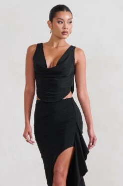 Both feminine and classic, our Femme Classique crop top couldn’t be more perfectly named. Boasting a draped cowl neckline that carries into an open back, this black corset top would be ideal for date night, especially when styled with our ruffled maxi skirt La Belle.