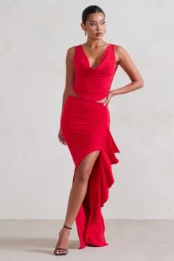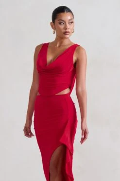 Both feminine and classic, our Femme Classique crop top couldn’t be more perfectly named. Boasting a draped cowl neckline that carries into an open back, this red corset top would be ideal for date night, especially when styled with our ruffled maxi skirt La Belle.