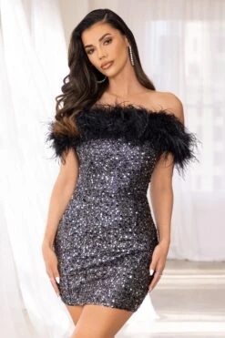 This ultra-feminine “Flashy” mini dress is one of our new season favorites. This dress perfectly frames your shape with its structured bodice, while the eye-catching sequin fabric adds major drama. This gorgeous style featuring its feather bardot neckline will ensure all eyes will be on you this party season.