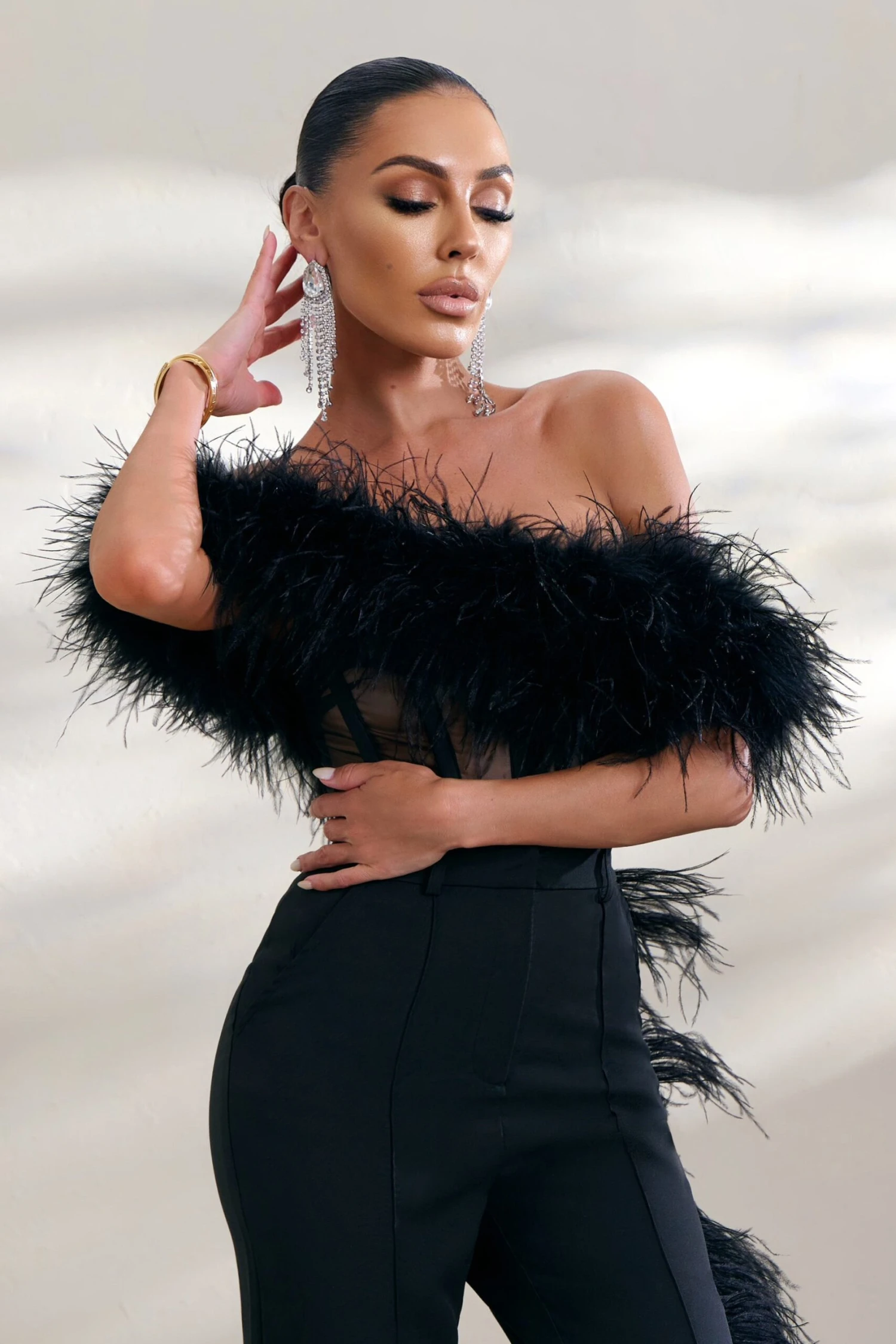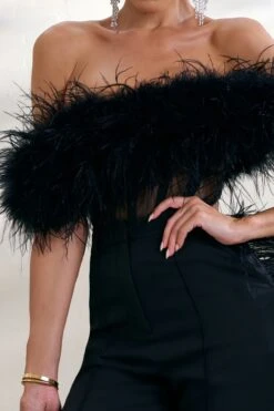 Looking for the style for that special event? Our stunning โโFor Youโโ bodysuit is the perfect match for any occasion. Featuring a gorgeous bardot neckline revealing your sophisticated cleavage and an extravagant feather trim to level up your glam game. The corset bodice will cinch your figure to perfection creating the dreamiest hourglass shape. Style this bodysuit with high waist trousers and heeled sandals, perfect for your next black-tie or VIP event. Get ready to steal the spotlight with this show-stopping style!