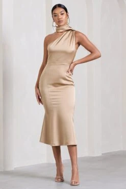 Golden Girl | Champagne Satin Asymmetric High-Neck Flared Midi Dress