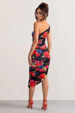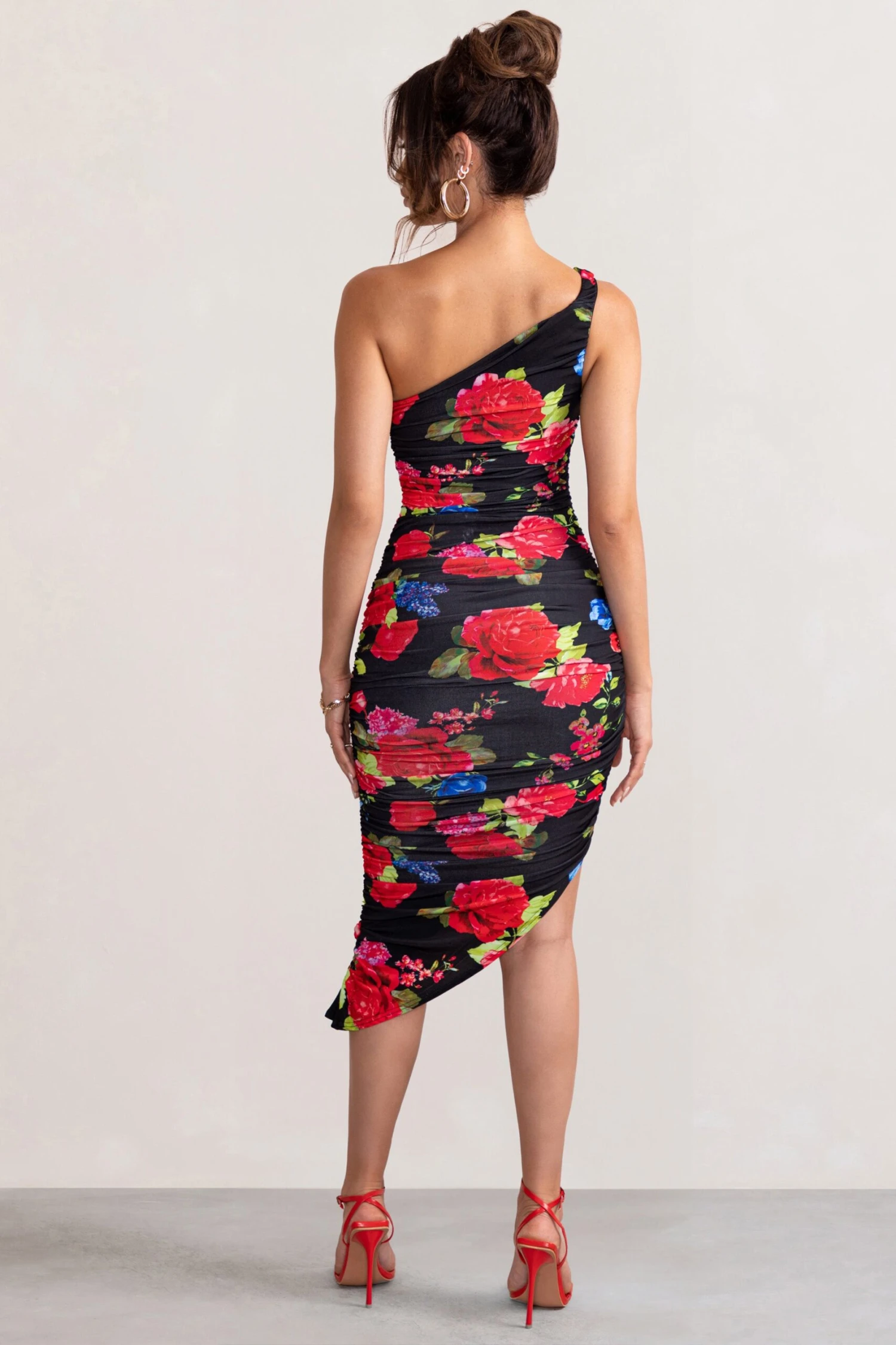 Late Night | Black Floral Print Asymmetric One Shoulder Ruched Midi Dress
