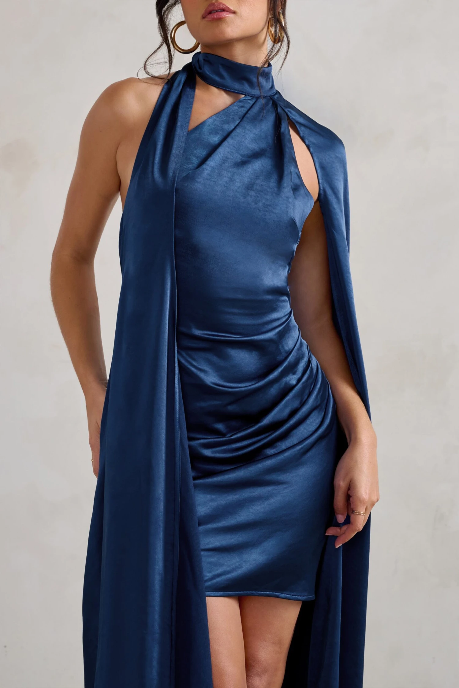 Engagements, birthdays and black tie events are all worthy of our new mini dress, Laurelie. Framing your curves in luxurious navy satin, this backless showstopper boasts a long scarf which wraps the neck then falls into an elegant cape from behind. As comfortable as it is contouring, Laurelie also features subtle hook and zip closures for easy dressing