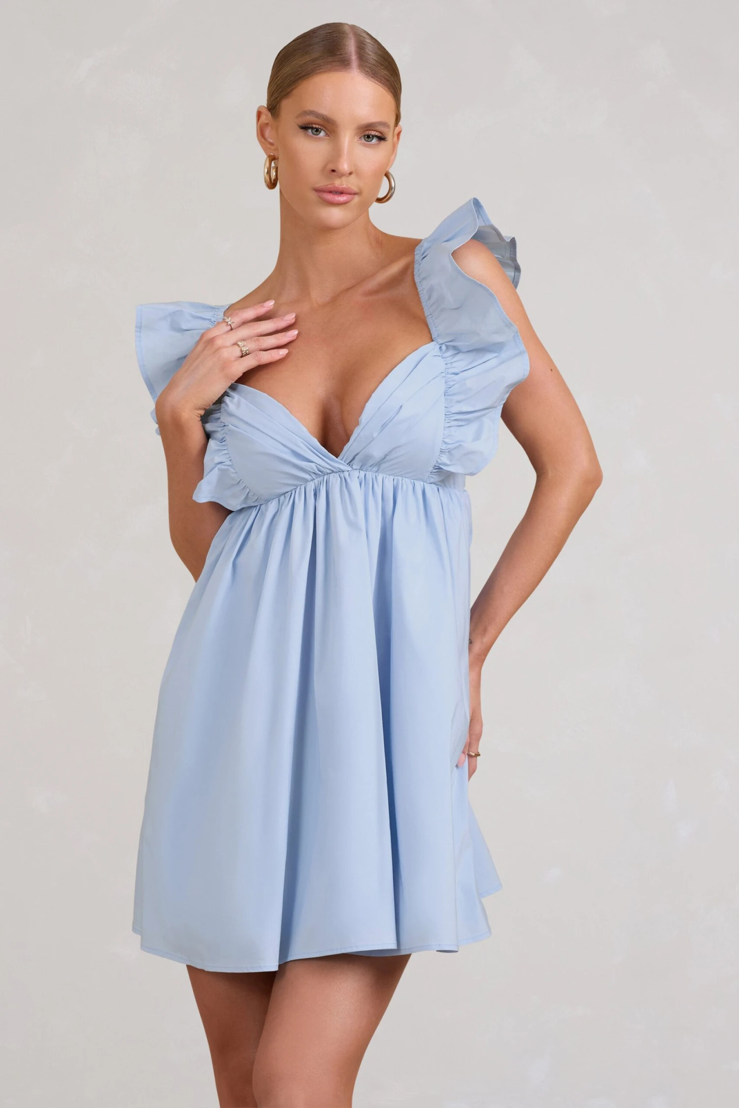 This sweetly smocked mini dress is perfect for the warm months ahead, designed in a comfortable stretchy cotton poplin with short ruffled sleeves for added femininity. Finished with delicate laces that tie across an open back, Let’s Laze is the blue babydoll dress to pack for your next summer escape.