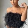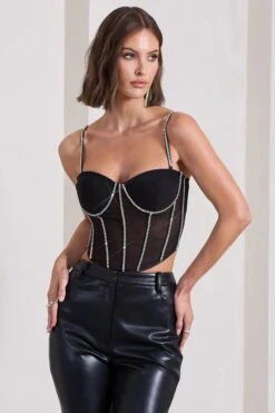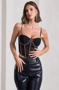 Elevate your party wardrobe this season with a statement piece like Lights On. This diamante encrusted black corset arrives in a sheer organza fabric, lined with structured boning and wired padded cups. Removable cami straps add a sense of versatility to this crop top, allowing you to style it however you choose during your next night out.Â