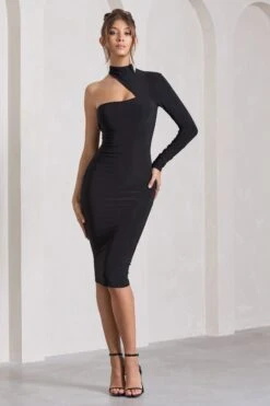 Our newest black midi Liz is the perfect combination of a classic silhouette with a new season edge. Made in our premium jersey structured to cinch your natural curves, this bodycon is transcended by a self-tie sash, striking open back and flattering ruching. For an elevated party-ready look, try styling Liz with a tousled bun and statement earrings.