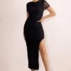 Marquise is the elegant midi to make an impact at that upcoming soiree, designed in a weighted black satin that feels as luxurious as it looks. Catching the eye with a trim of diamantes, this black midi dress also features a classic halter neckline and a gathered skirt cut in an asymmetric line. Marquise is a must-have for weddings especially when paired with sparkling silver hoops.