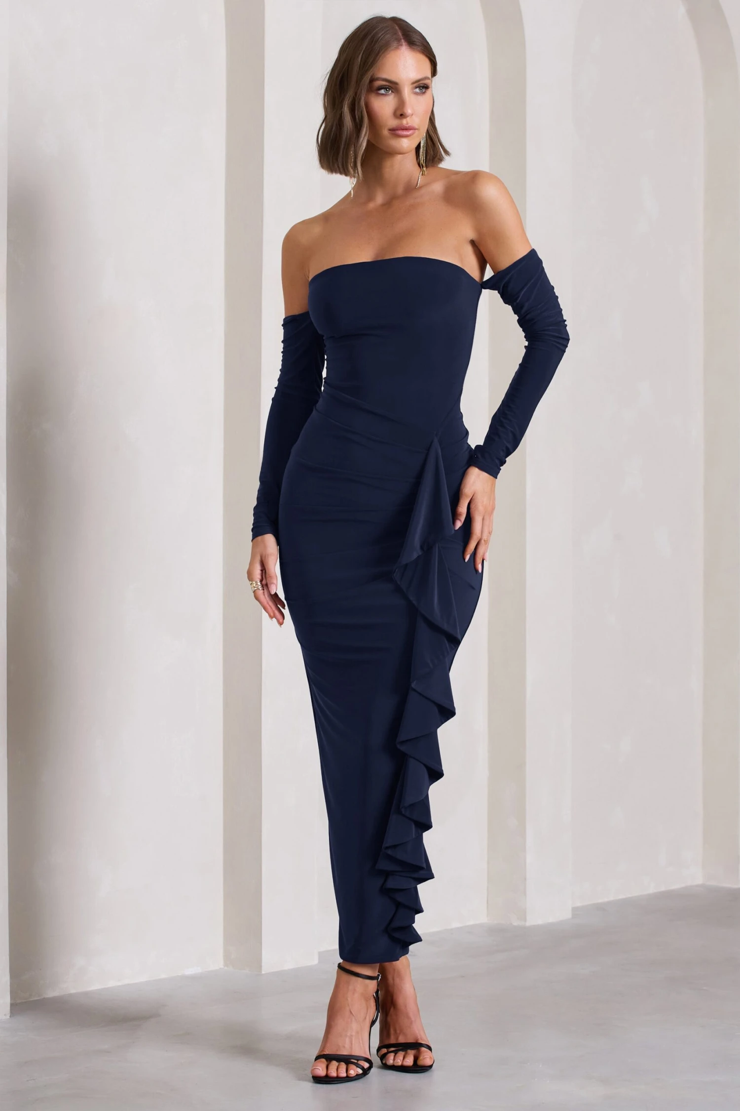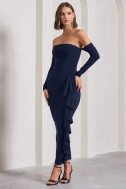 Carefully crafted in a premium stretch scuba crepe, this form-flattering navy maxi dress is a formal wardrobe must-have. Drawing attention to Montana is a large ruffle detail draped elegantly across a flattering gathered skirt. Try styling this bardot maxi dress with a pair of strappy stilettos for the perfect race day ensemble.Â