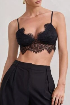 Add a romantic touch to your nightwear wardrobe with our black bralette Natalia. Designed in a luxurious lace woven with artful florals, this supportive bralette is detailed by adjustable cami straps and a satin laced tied back.