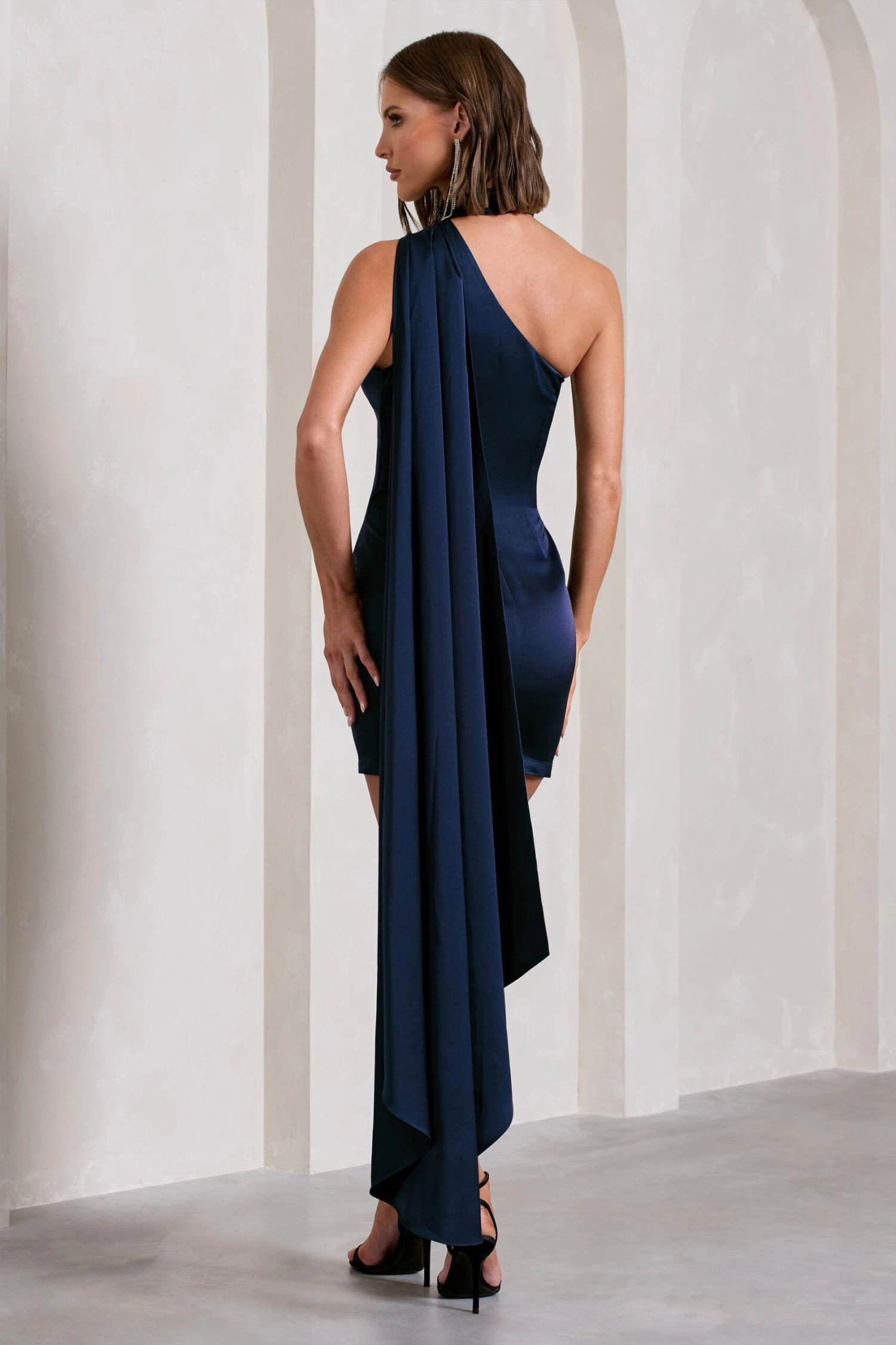 Whether its a birthday celebration or cocktails with the girls, embrace elegance in Natalie. Crafted in a rich sumptuous silk, this alluring mini is defined by its asymmetric neckline and long, draped scarf. To elevate this navy mini dress, try styling it with some strappy stilettos and gold earrings.