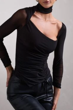 Elevate any going-out look with our must-have asymmetric top Nicole. Arriving in a classic black shade, this ruched piece features a gathered halter collar and is finished with long sheer mesh sleeves. Try pairing Nicole with our Jackie trousers for a match made in heaven.