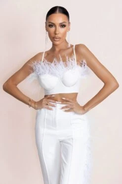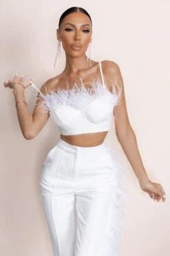 Meet our beautiful Prestige cropped bralette. Featuring delicate cami straps and moulded cups, this top flaunts a sophisticated sweetheart neckline. Crafted with our premium crepe fabric, the feather trim detail will add a luxurious element to any outfit. Pair with our Take Your Time trousers at your next hen party or special occasion.