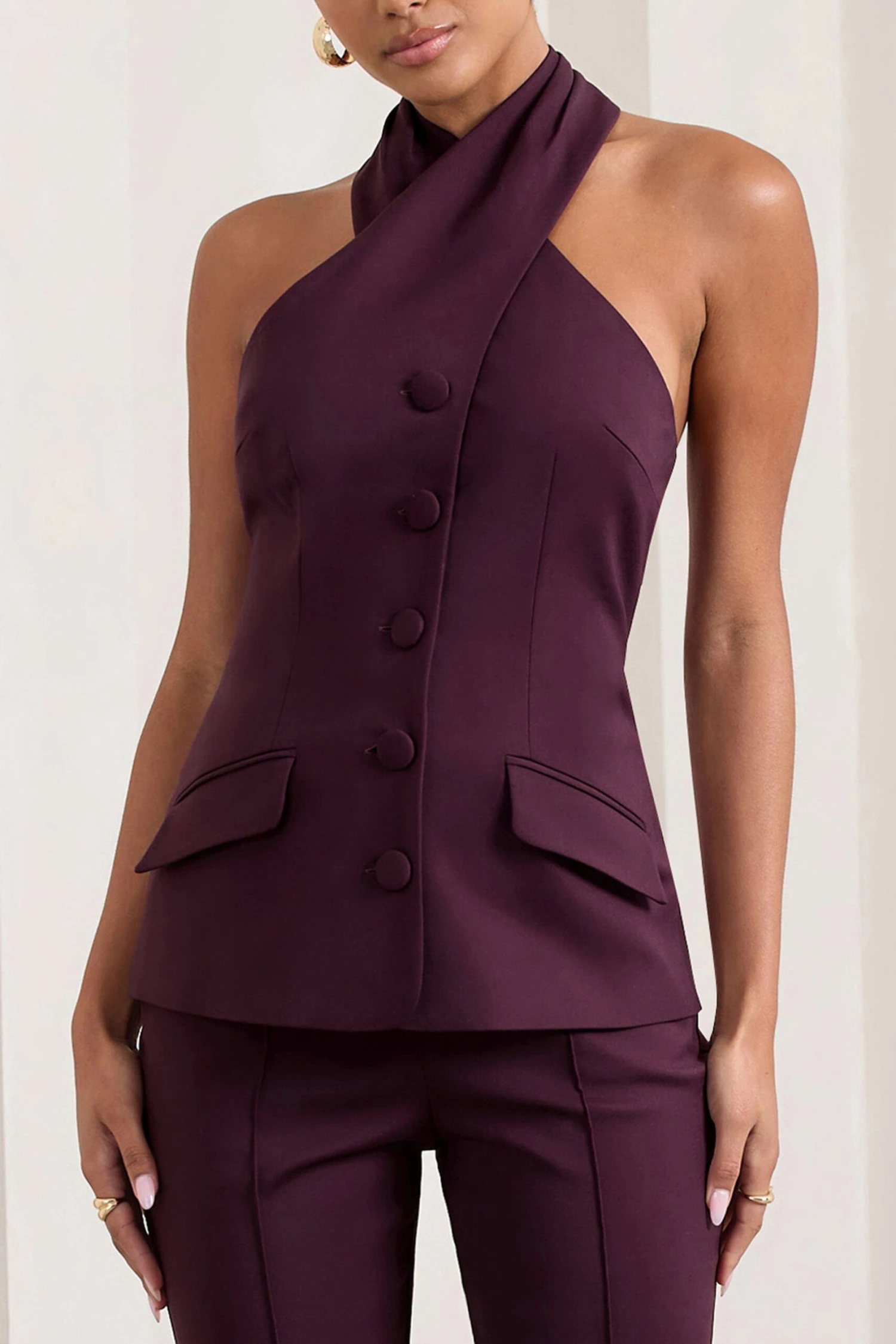Super stylish and flattering, our Remi top has been designed to stand out. With a sophisticated tailored fit, this gorgeous tuxedo style top in a burgundy hue features a halter neck design to reveal your feminine shoulders with front button fastening enhancing your silhouette and bold pocket detailing. Style this stunning top with our Kehlani wide leg trousers and get ready to make an entrance at your next cocktail night, glam party or night out with the girls. Get ready to be the best dressed in Club L’s statements.