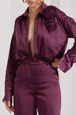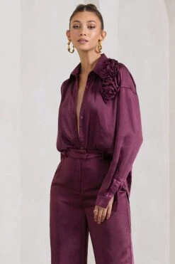 No wardrobe is complete without a soft satin staple like Rosanna. Arriving in a rich burgundy shade, this oversized shirt is defined by two statement floral corsages that elevate this everyday piece to a formal must-have. Try pairing Rosanna with our No Limits trousers for the perfect dinner date ensemble.