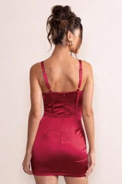 Our Scarlett mini dress is pure luxury crafted with our premium satin design in a gorgeous berry hue. Featuring a curve-contouring corset bodice to highlight your hourglass figure, moulded cups, adjustable straps with a gorgeous gold trim detail, and an underwire bust for prime support. The invisible zip fastening is perfect for easy on and the bodycon fit is super flattering. Style this mini dress with heeled sandals and walk in style to your next after-party, glam night out or VIP event. Flattering and chic, this style is a must-have!