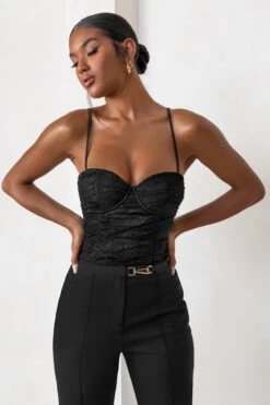 Flattering and perfect for minimalistic dressing, meet our gorgeous Tallula corset top. Featuring a beautiful sweetheart neckline with adjustable satin straps and gold zip fastening for prime support. Its corset bodice will cinch your waist creating an hourglass figure and the ruched design is super flattering. Match this corset top with your favourite midi skirt or black wide leg trousers and get ready to have all eyes on you at your next glam night out or special event on your agenda. Evening glamour just got better!
