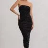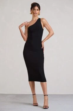 This black bodycon dress is not only classic in an asymmetric silhouette but its premium stretch jersey composition makes it also incredibly comfortable. Vineyard is adorned with one wide strap that artfully loops over an open back. Style this must-have midi dress with strappy heels and statement hoops for a versatile look suited to any special occasion.